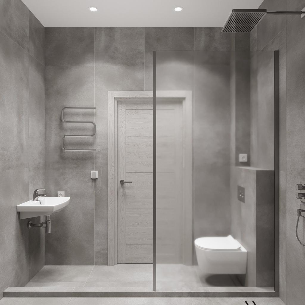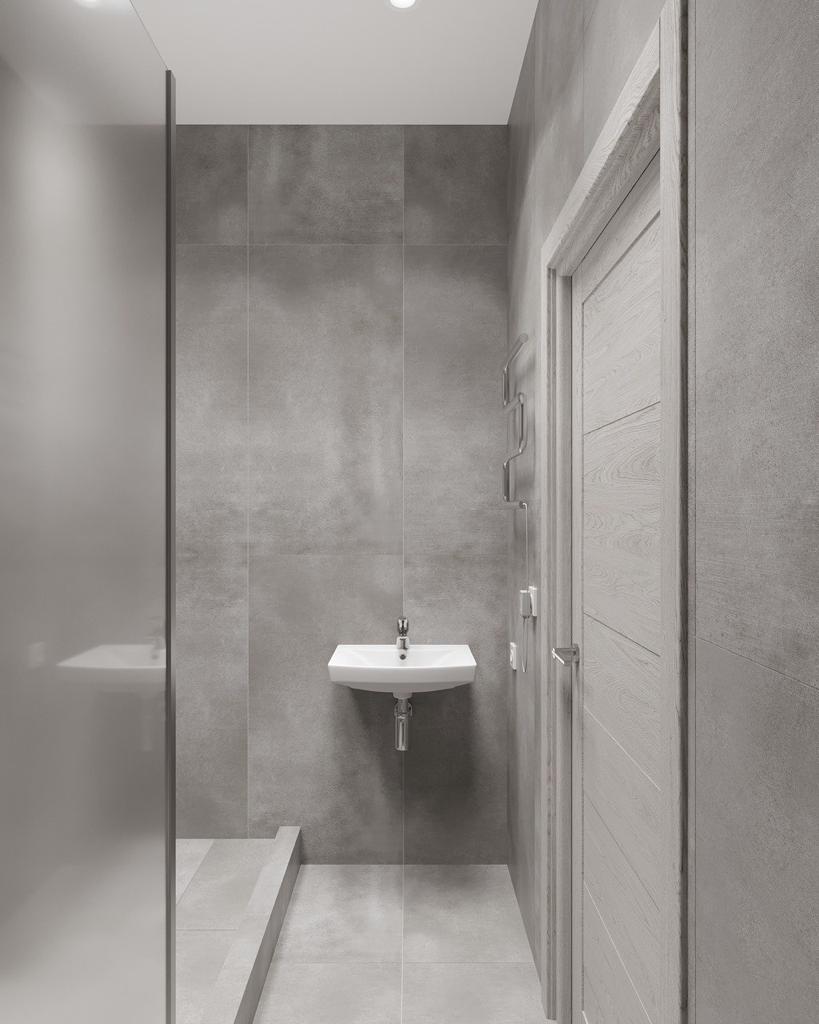 Стены полностью от пола до потолка керамогранит широкоформатный 120х60, цвет серый (Скандинавский стиль). Душевой поддон из полнотелого кирпича с многослойной гидроизоляцией.